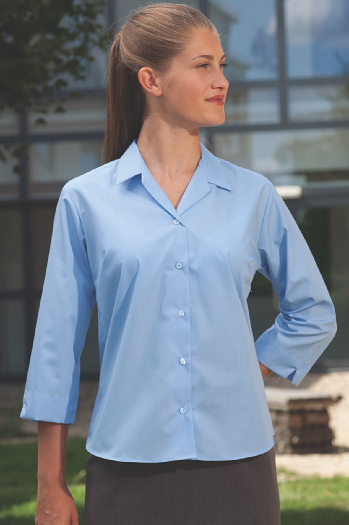 Banner Fitted Blouse with 3/4 Length Sleeves, Sky Blue, Twin Pack
