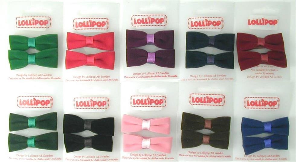 Stylish hair clips in the shape of a BOW with snap fastening and a lovely velvet finish. Packed 2 to a card & available in 9 different colours, ideal to match any school colours.