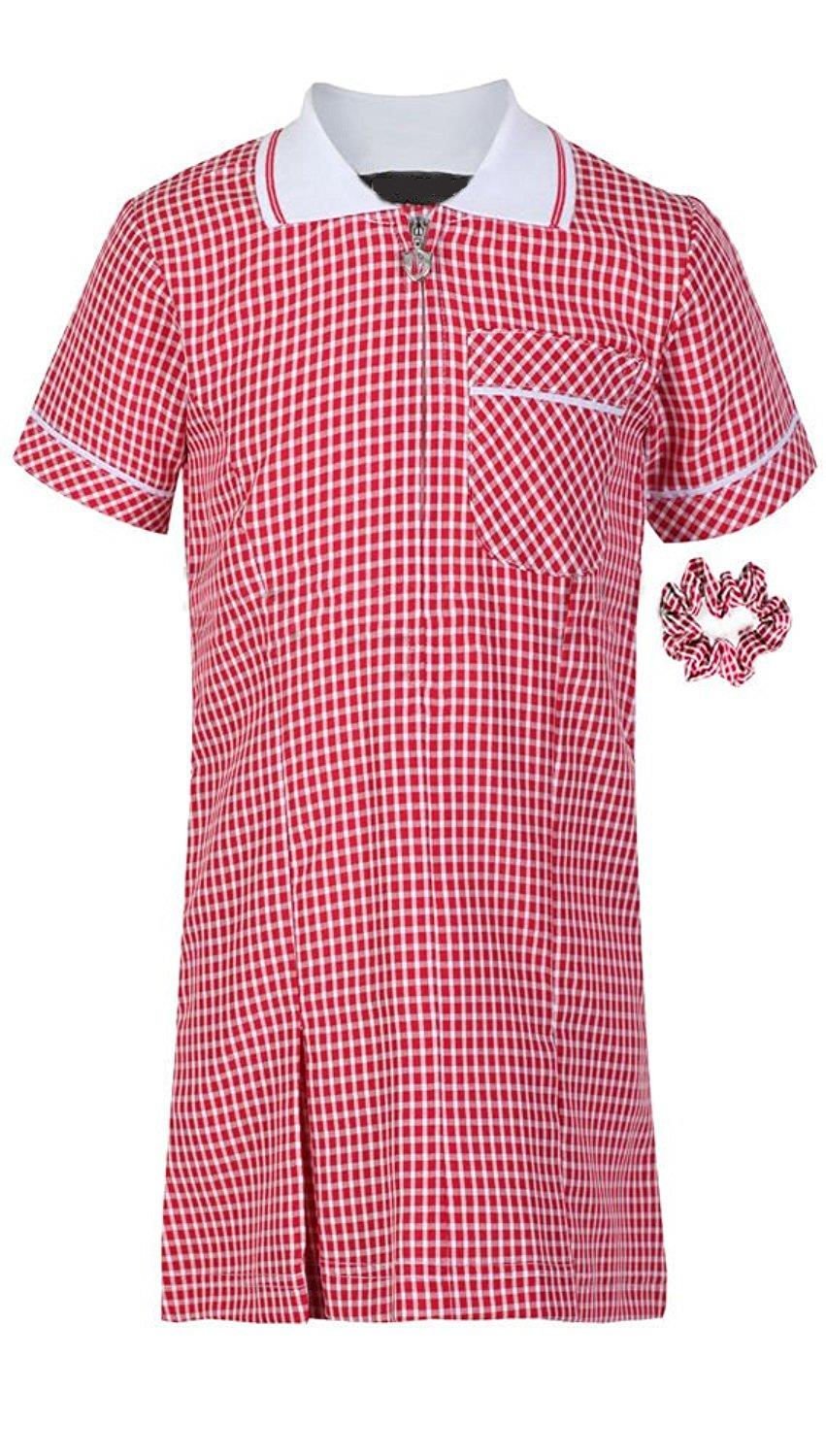 RED – zipped gingham check summer dress with front pleats & breast pocket. Comes with free matching scrunchie.