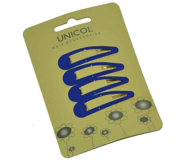 Unicol Hair Clips with snap fastening and a colourful enamel finish. Available in 8 different colours and packed four to a card.