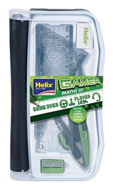 Practical maths set with additional 15cm Stencil Ruler with gaming features.  High qualtiy Helix brand.
