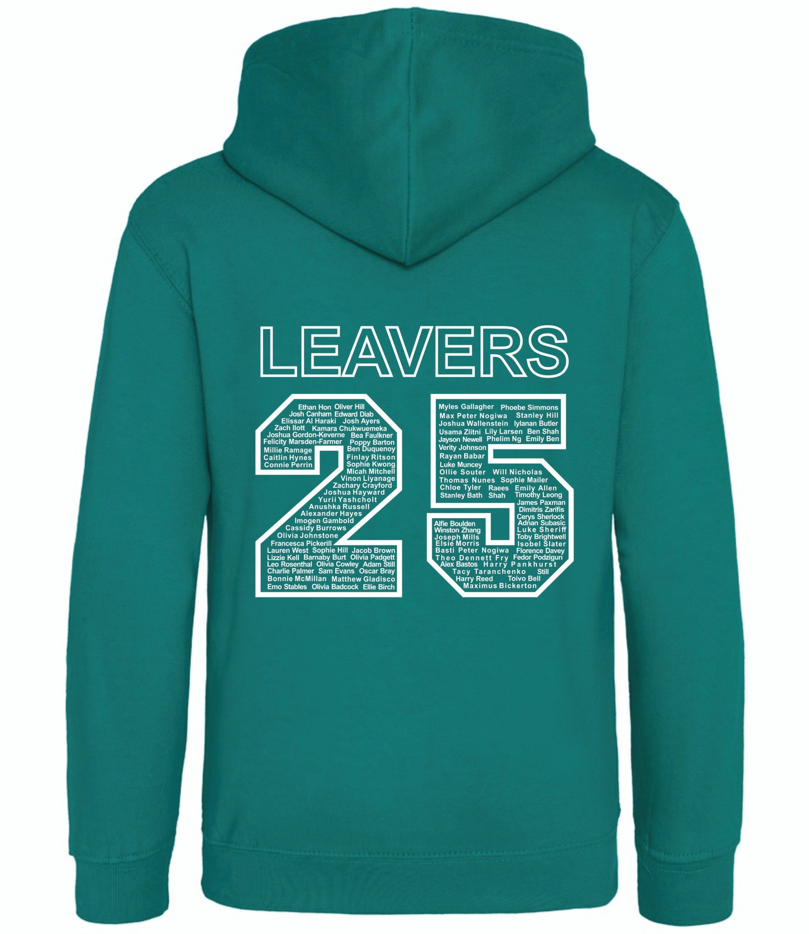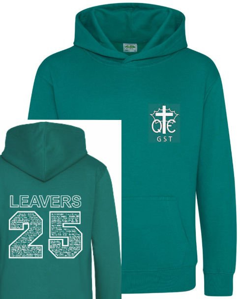 The front of the hoodie is printed with the school logo in white and on the back the “25” leavers design with names inside.