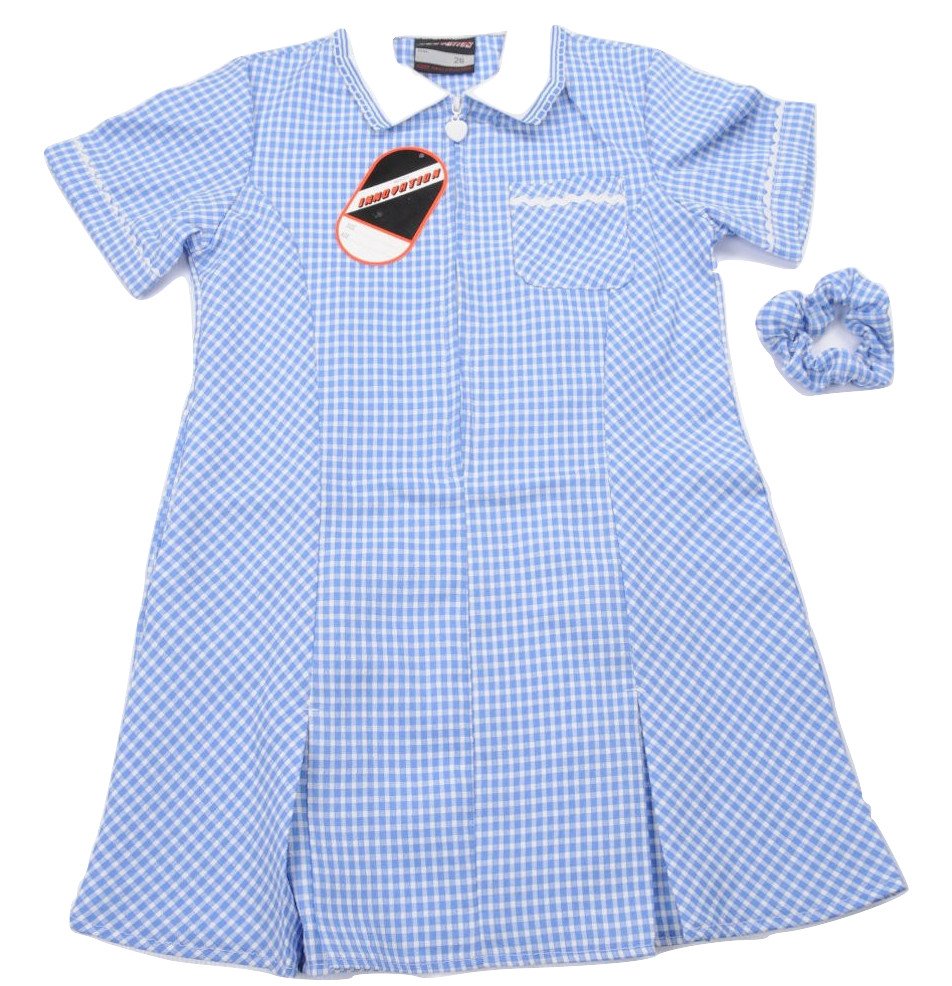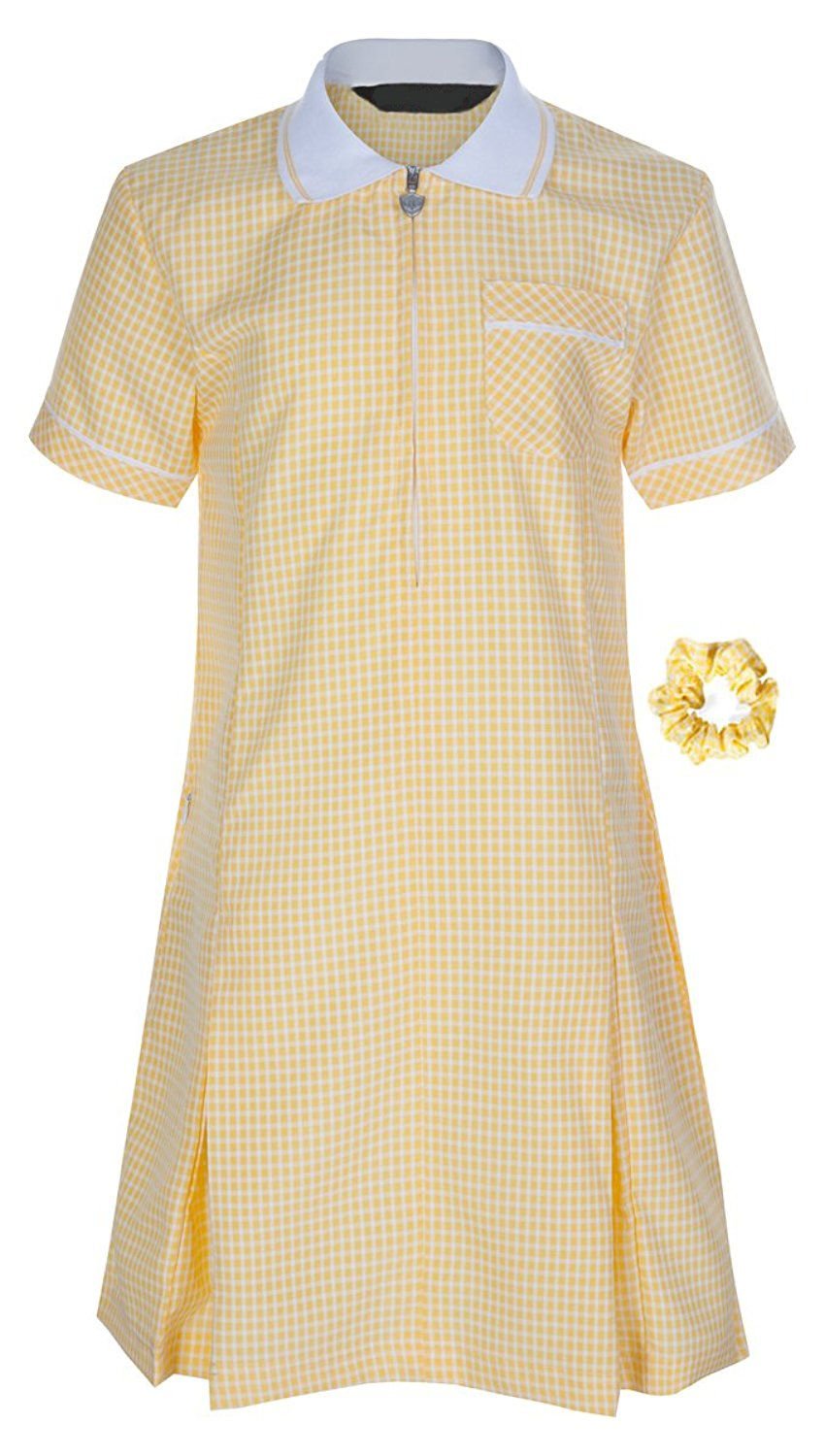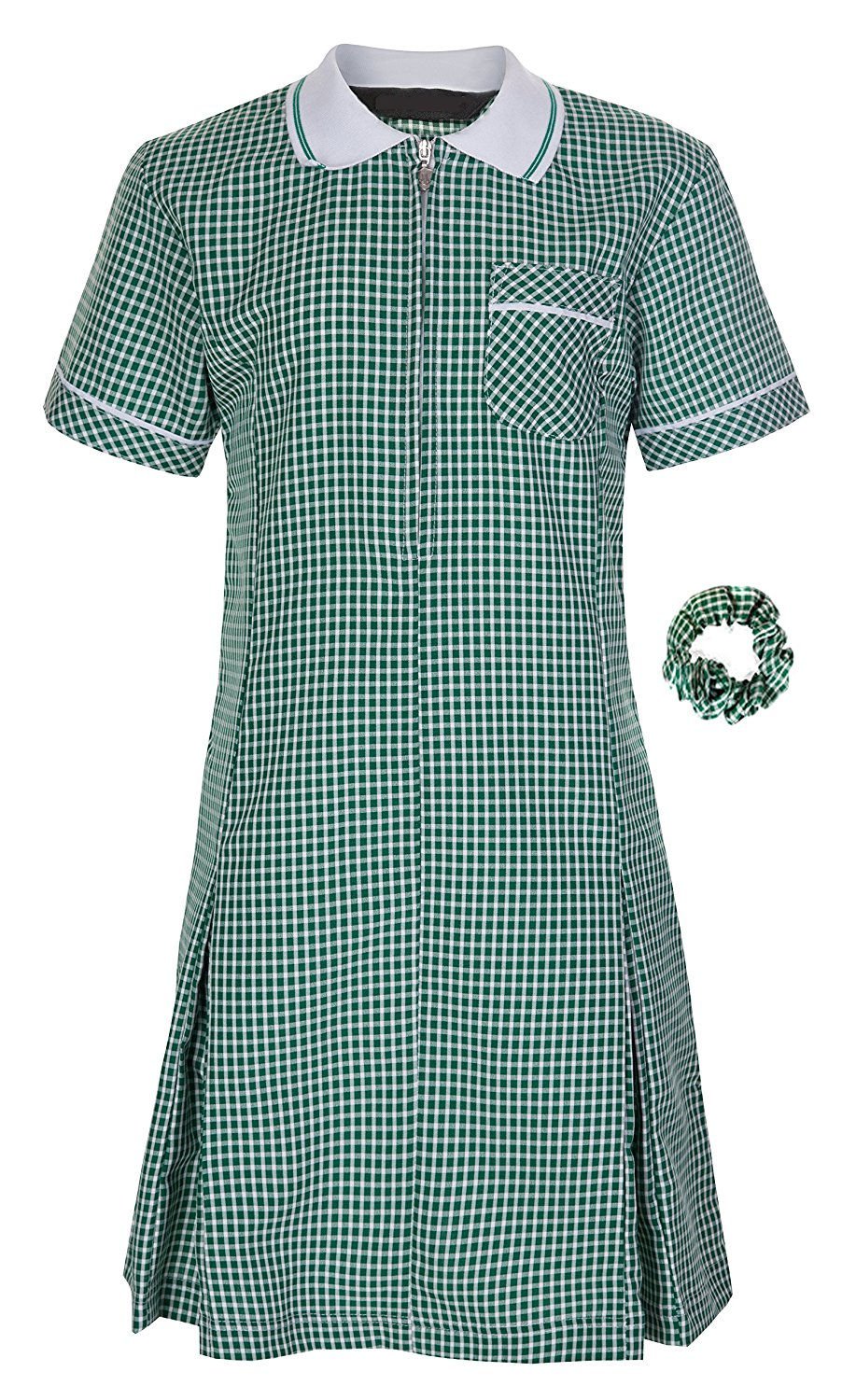 Zipped gingham check summer dress with front pleats & breast pocket – in larger sizes. Comes with free matching scrunchie.